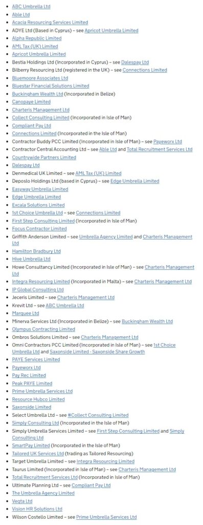 HMRC Regularly updates a list of companies, promoters, enablers and suppliers on their website. We have compiled these lists and keep them updated regularly.